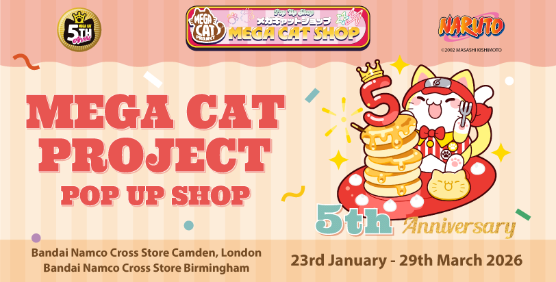 Celebrate five years of MEGA CAT PROJECT with a limited-time anniversary pop-up, featuring adorable MegaHouse collectibles and feline fun. Only between the 23 January – 29 March 2026. At Bandai Namco Cross Store Camden, London & Bandai Namco Cross Store Birmingham